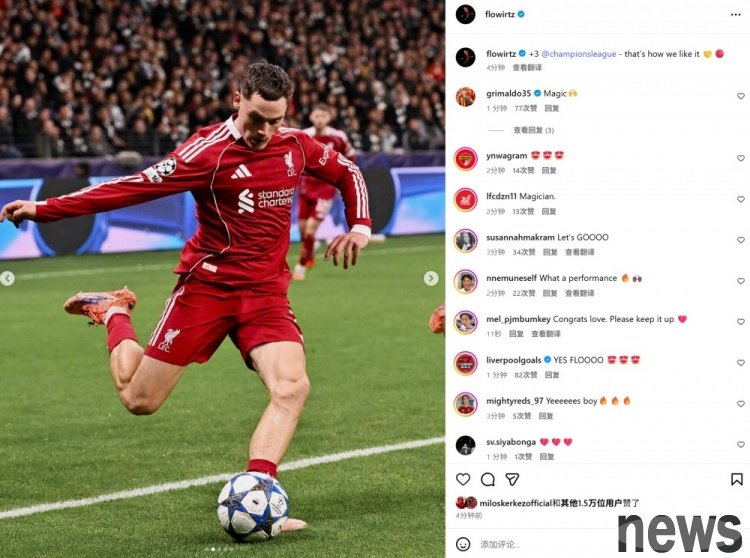 In this round of the Champions League, Liverpool defeated Frankfurt 5-1. Wiltz made two assists in this game, breaking away from his previous inability to participate in scoring goals. Wirtz posted a photo on social media and wrote: Get three points...