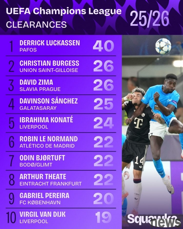 Three rounds have been played in the Champions League this season. Squawka has compiled a list of clearances so far. Paphos defender Lucassen leads the way with 40 clearances, followed by St. Gilos defender Burgos and Slavia Prague defender Zima with 26 clearances.