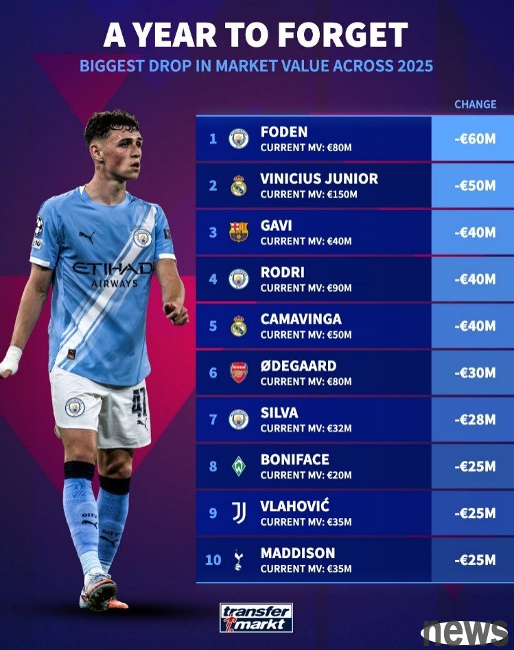 Dezhuan has taken stock of the list of football player value declines in 2025, among which Foden has dropped the most by 60 million euros. The following is the specific list:
