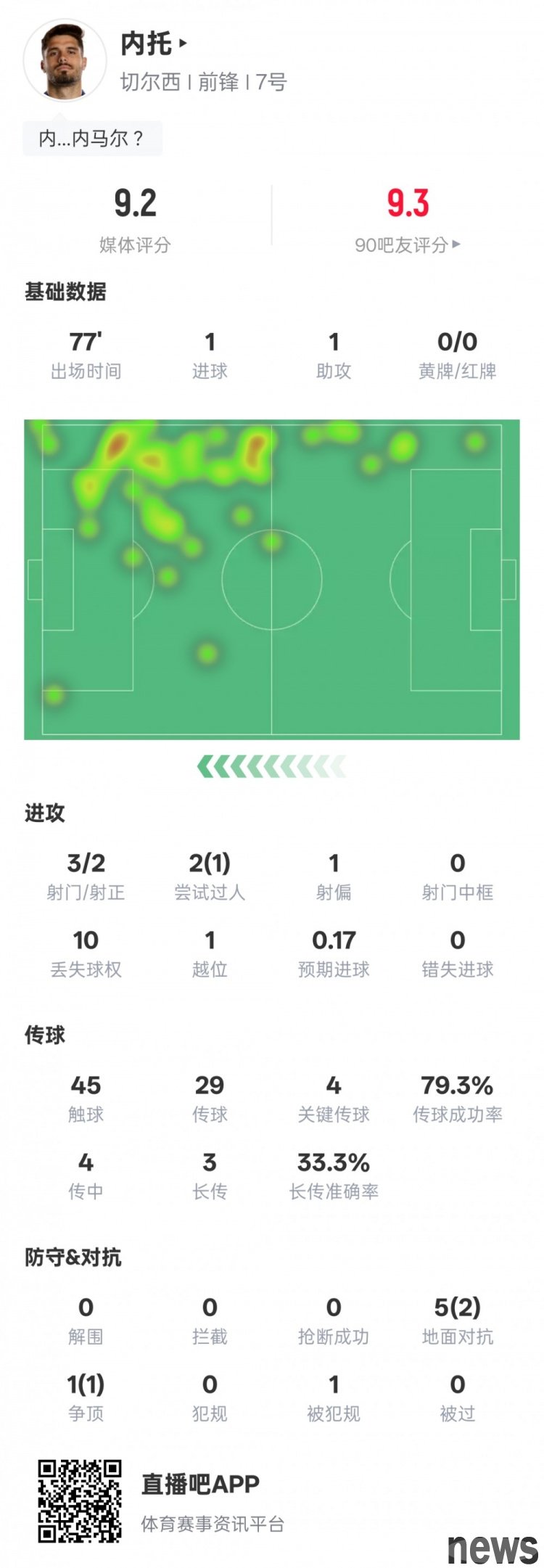 In the 8th round of the 2025-26 Premier League season, Chelsea played away to Nottingham Forest. Neto started the game, passed and shot, and made 4 key passes, with a rating of 9.2. Neto's specific statistics for this game are as follows: Goal 1...
