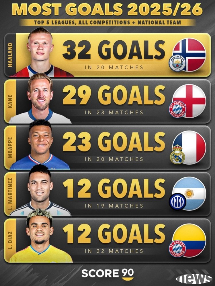 Score90 counted the number of goals scored by players in the five major leagues for clubs and national teams this season and listed the list. Haaland ranked first with 32 goals, followed by Kane and Mbappe.