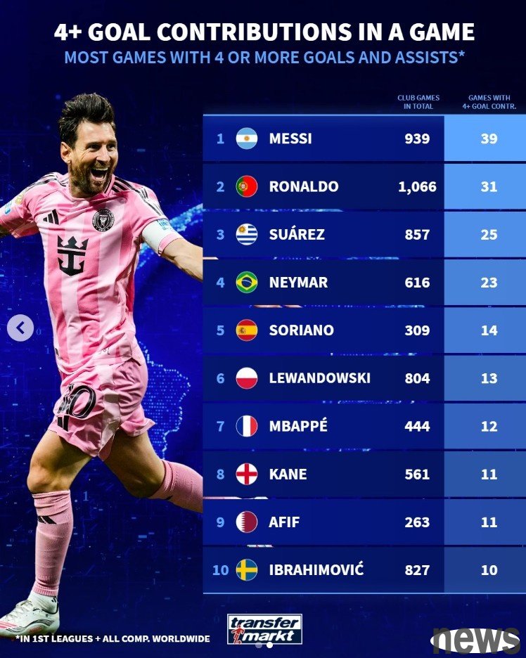 Inter Miami defeated FC Cincinnati 4-0 in today's playoffs. Messi scored 4 goals with 1 shot and 3 passes. "Transfer Market" statistics show that Messi is also the player who has participated in the most 4+ goals in a single game at the club level.