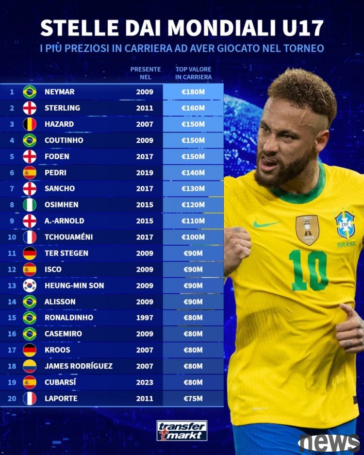 Dezhuan has listed the highest net worth of players who have participated in the U17 World Cup. Neymar ranks first with 180 million euros, followed by Sterling with 160 million euros.