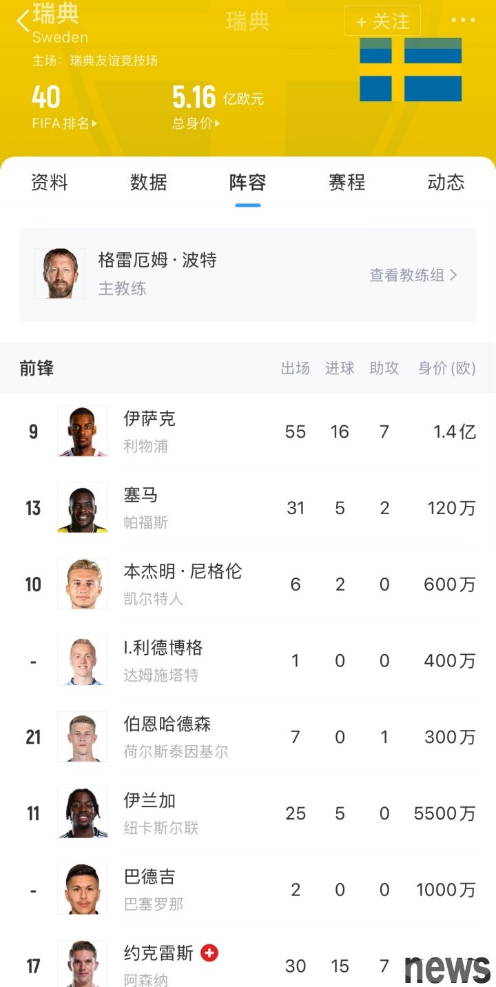In the European preliminaries of the World Cup, Sweden lost 1-4 to Switzerland and ranked bottom with only 1 point in five rounds. The Swedish team's lineup has a total value of 516 million euros and has stars such as Isaac, Jocles, and Ilanga....