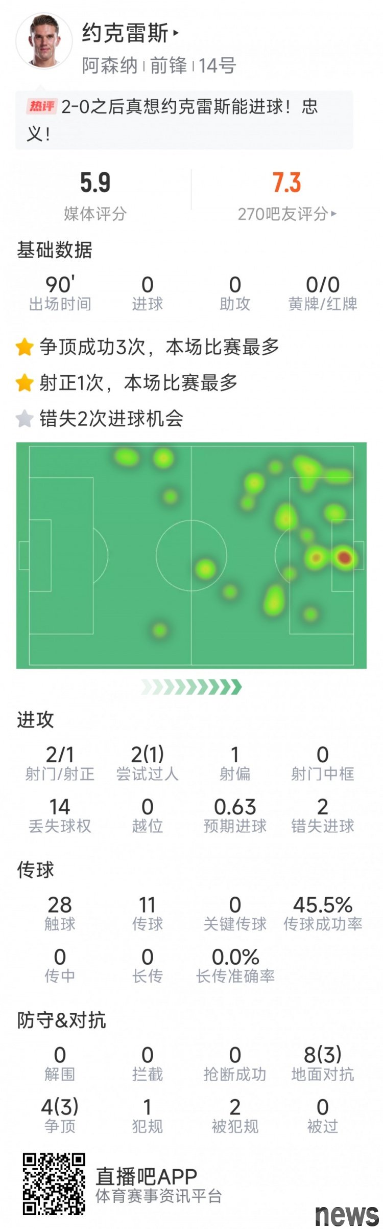 In this round of Premier League, Arsenal defeated West Ham 2-0. The following is Yorke's data for this game: 90 minutes of game time 0 goals, 0 assists 2 shots, 1 positive 2 missed the opportunity 28 touches Pass success rate 46% 12 confrontatio...